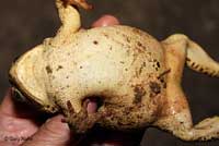 | Two calling males pulled from a breeding pond in Riverside County are shown giving weak release calls before being returned to the water. |