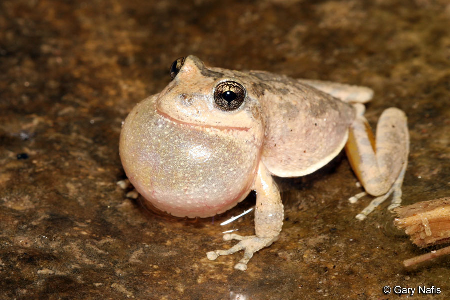 The advertisement call of the California Treefrog is a loud quick low-pitched duck-like quacking that ends abruptly and is given repeatedly. Males call at night.