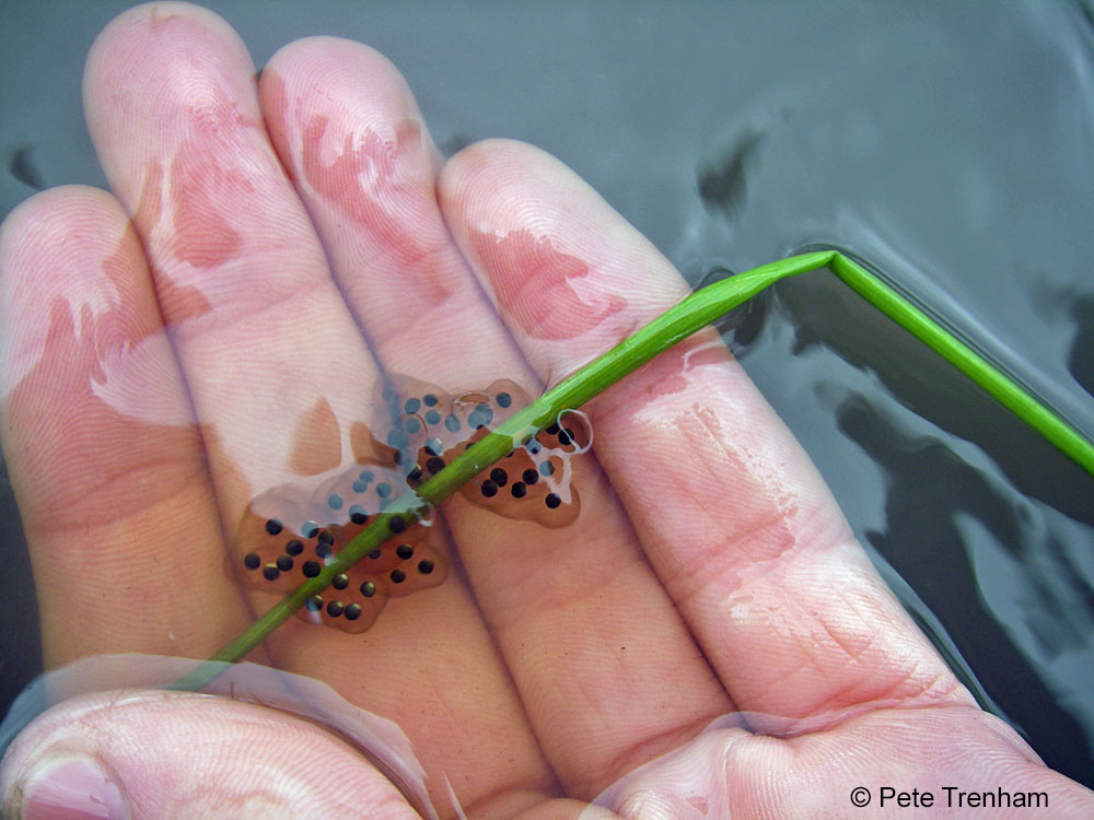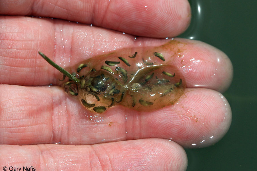 | Recently-deposited embryos found attached to spike rush just below the water surface in a large ephemeral constructed livestock watering basin, Monterey County © Pat Trenham |