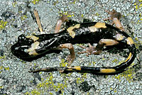 A medium-sized salamander with smooth skin, dark eyes with a yellow patch on top, a tail that is constricted at the base, and visible grooves on the sides between the legs.