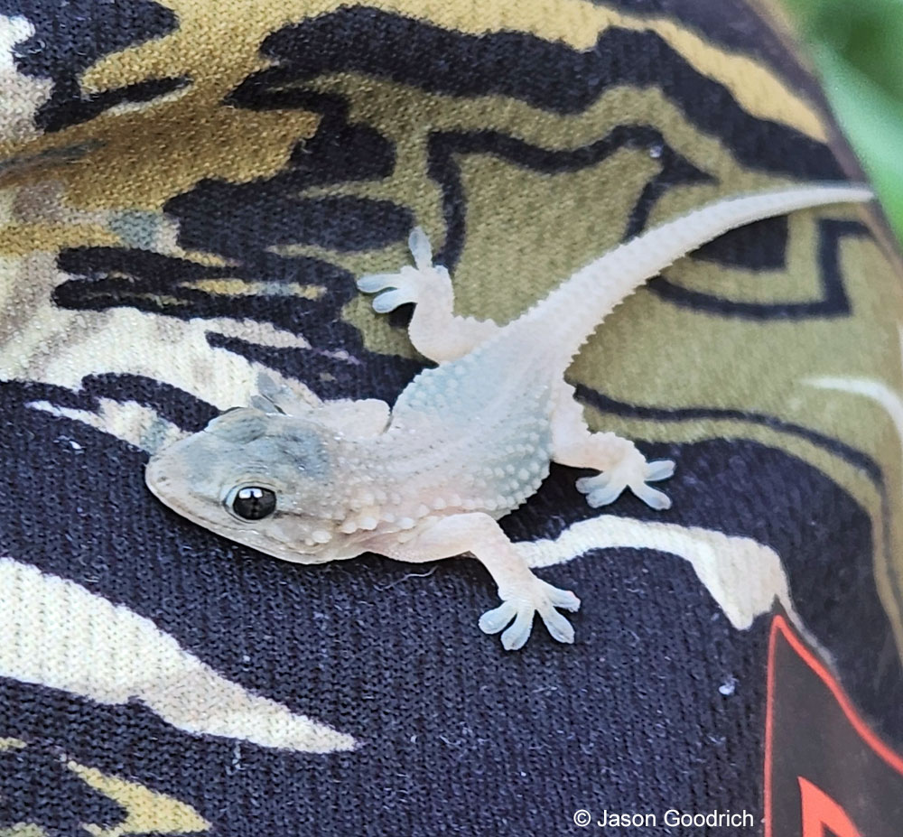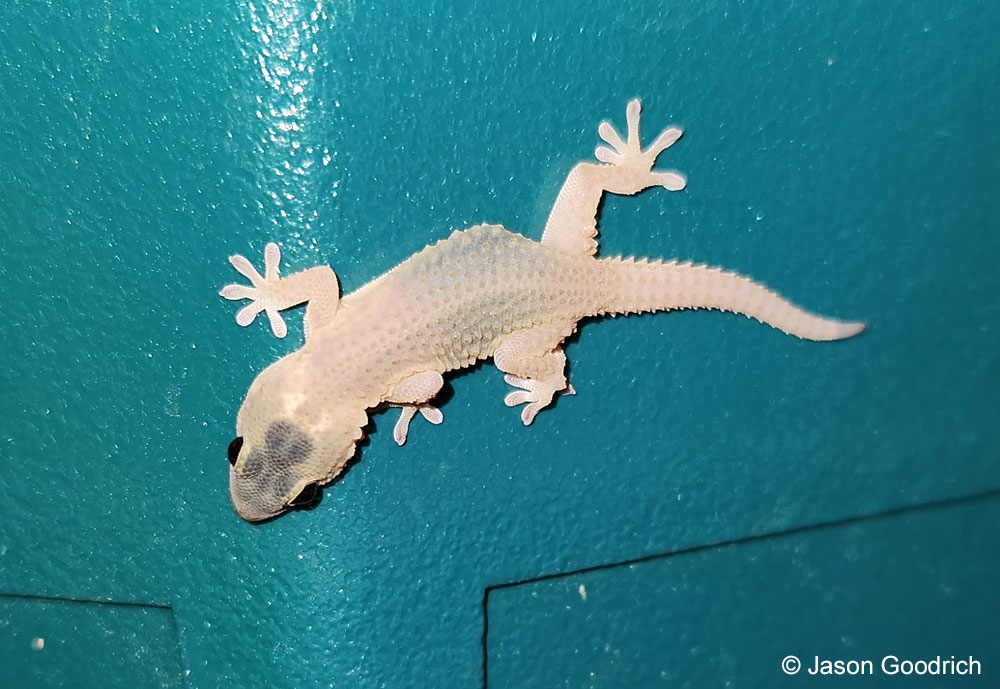 Two juvenile Moorish Geckos, about 2 inches in length, found in San Diego County, that appear to be leucistic.