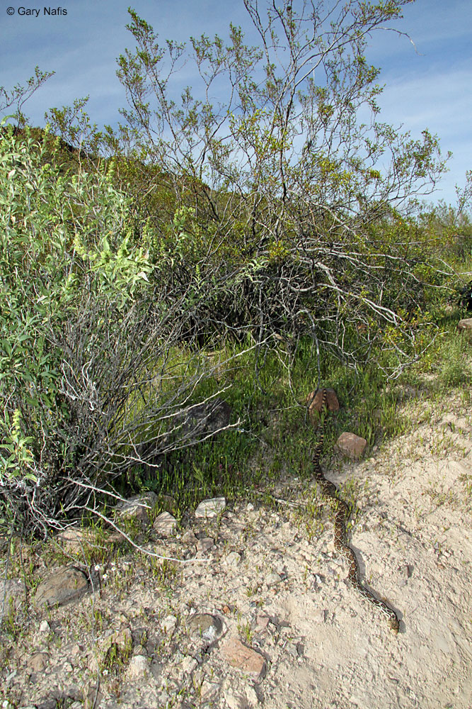 | A distressed Pacific Gopher Snake shakes its tail rapidly, which makes a buzzing sound as the tail touches the ground. This behavior might be a mimic of a rattlesnake's rattlng, or it could be a similar behavior that helps to warn off an animal that could be a threat to the gopher snake. |