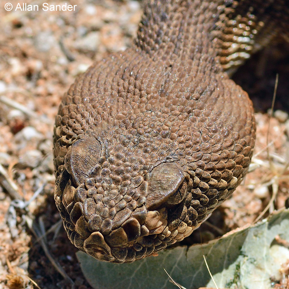A long, heavy-bodied pit viper, with a thin neck, a large triangular head, and a rattle on the end of the tail consisting of loose interlocking hollow segments.