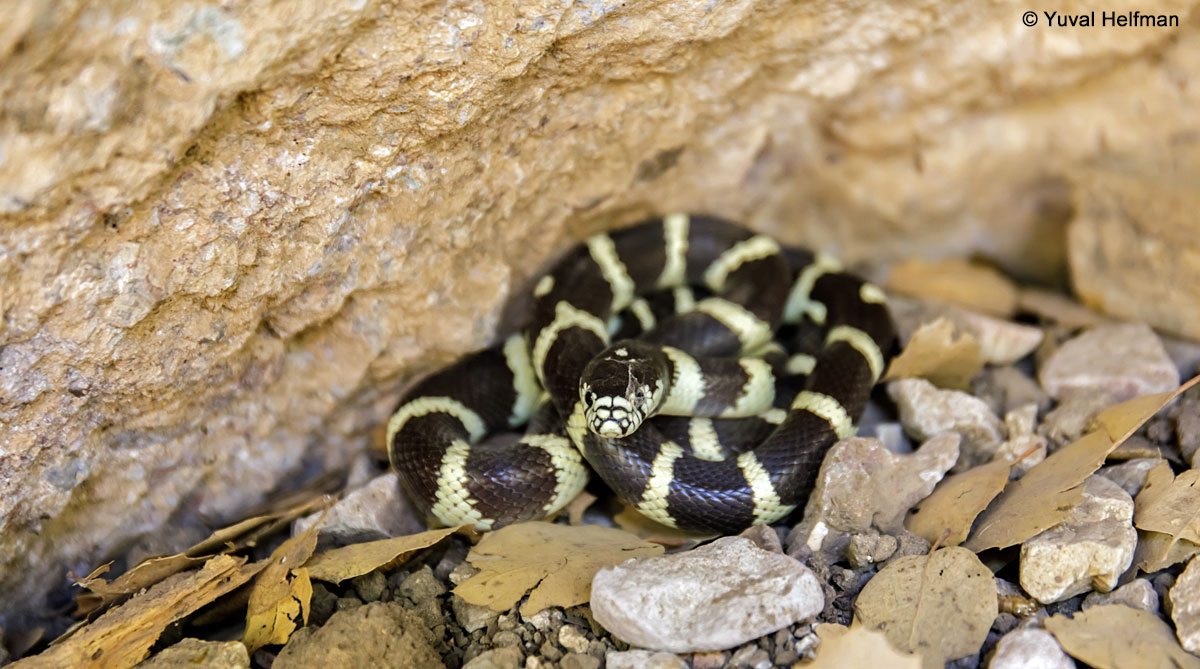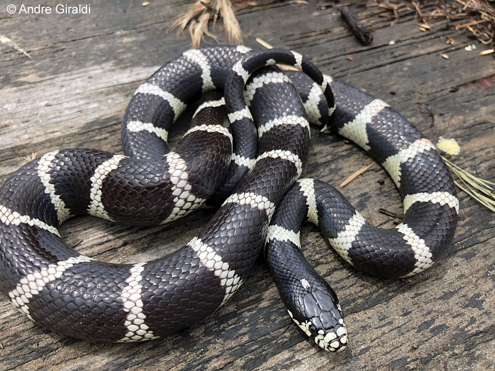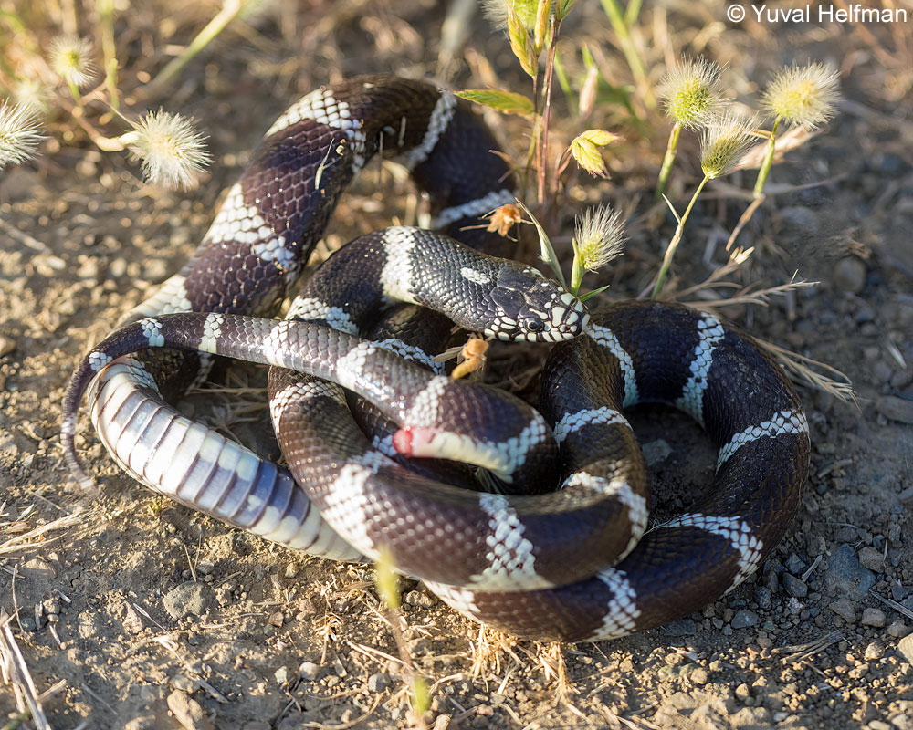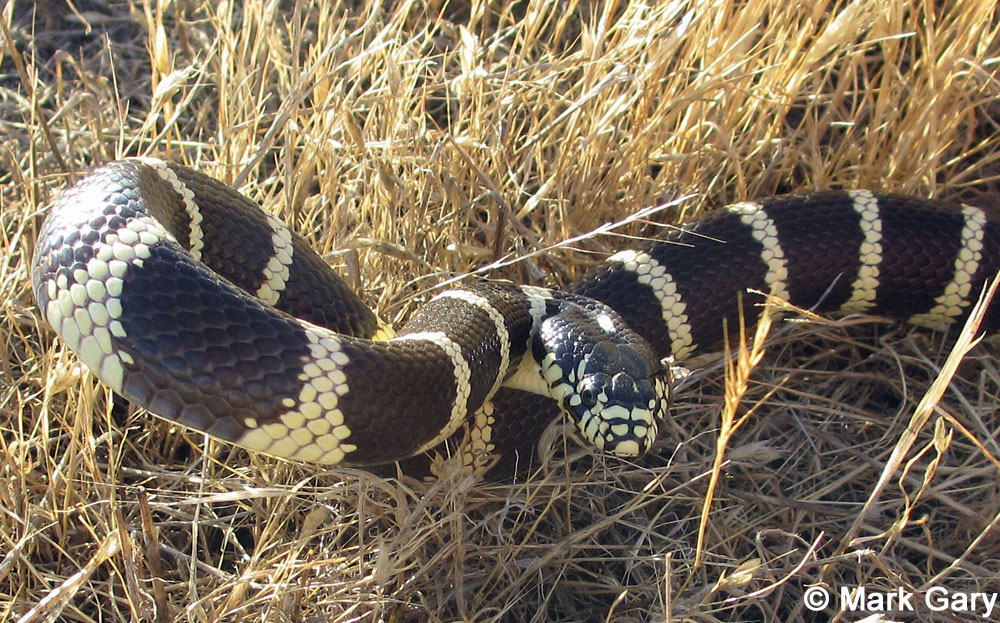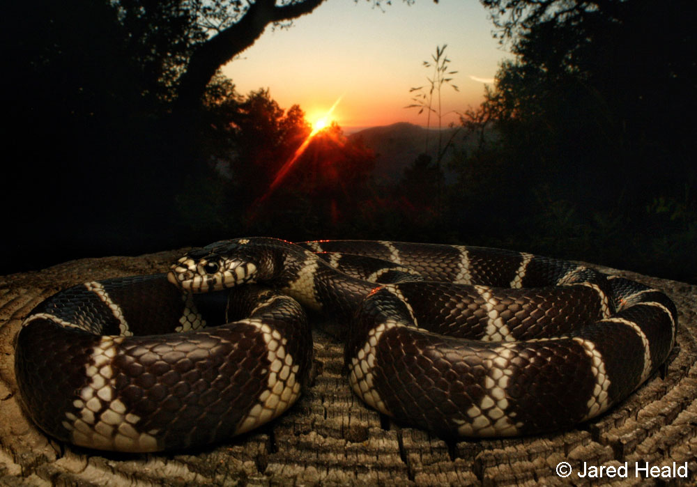 A striped phase California Kingsnake eating a juvenile Southern Pacific Rattlesnake in San Diego County. © Kimberly Deutsch |