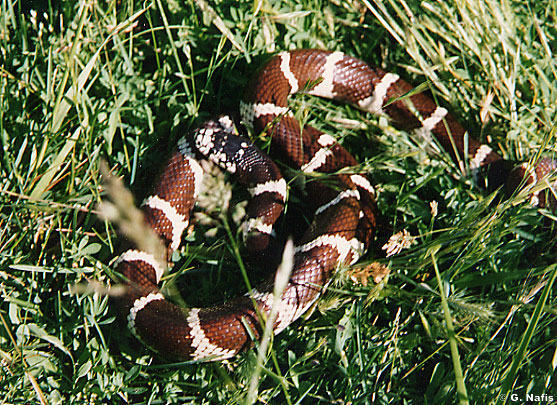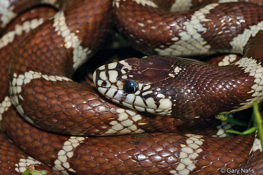 Lampropeltis california - California King Snake (Coluber [Ophis] Californiae; Ophibolus getulus eiseni; Ophibolus getulus californiae Ophibolus californiae; Coronella Californiae; Coronella getula, part; Coronella getulus var. californica. Blainville's King Snake; California Milk Snake, part) (Grinnell and Camp 1917)