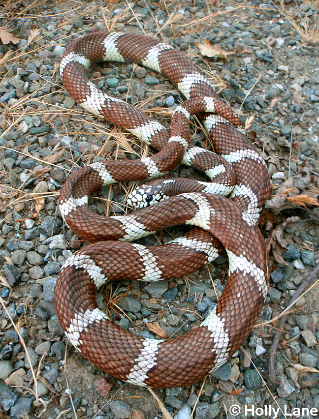 When encountered in th field, most wild California Kingsnakes don't often become defensive by assuming a threatening posture and striking, as this one did. |